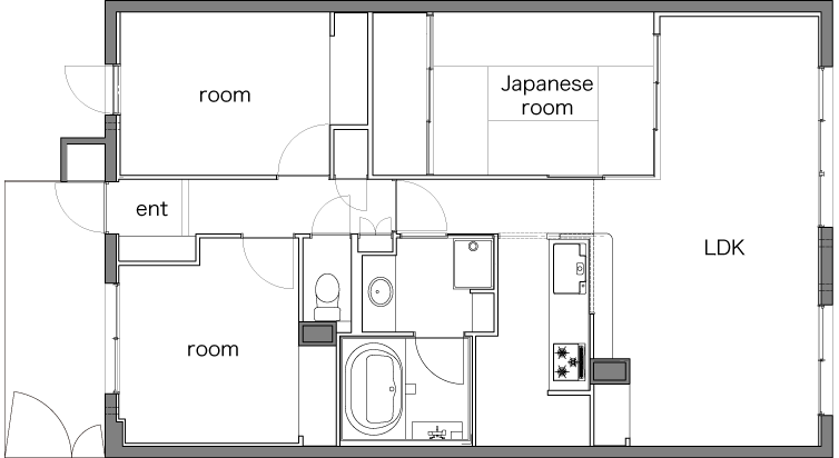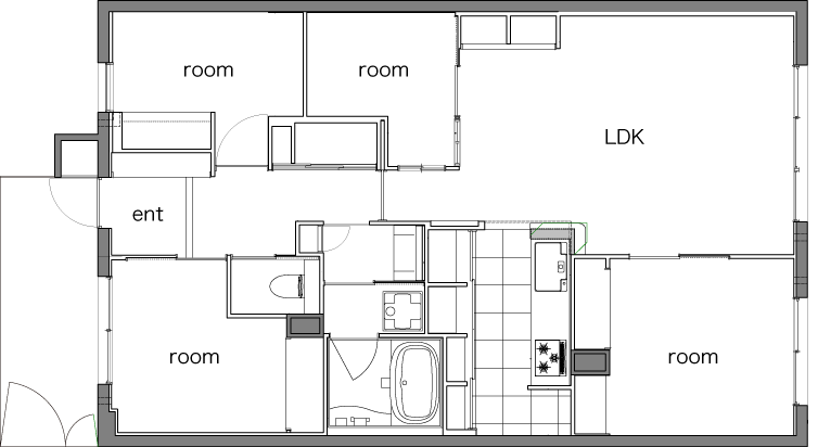 ご夫婦それぞれの居室、最低限の広さの子供室、同居のお母さんの個室。令和の共働き二世帯の施主様独自の住まい方は、 リノベーションでしか無しえません。コロナ禍ということもあり、廊下に面し、扉を隔てない場所にある洗面化粧台。 セミオープンで収納は全てクローズで納めたキッチン。床から便座が浮く、フロートタイプのトイレと、細かなこだわりを きっちり散りばめました。
